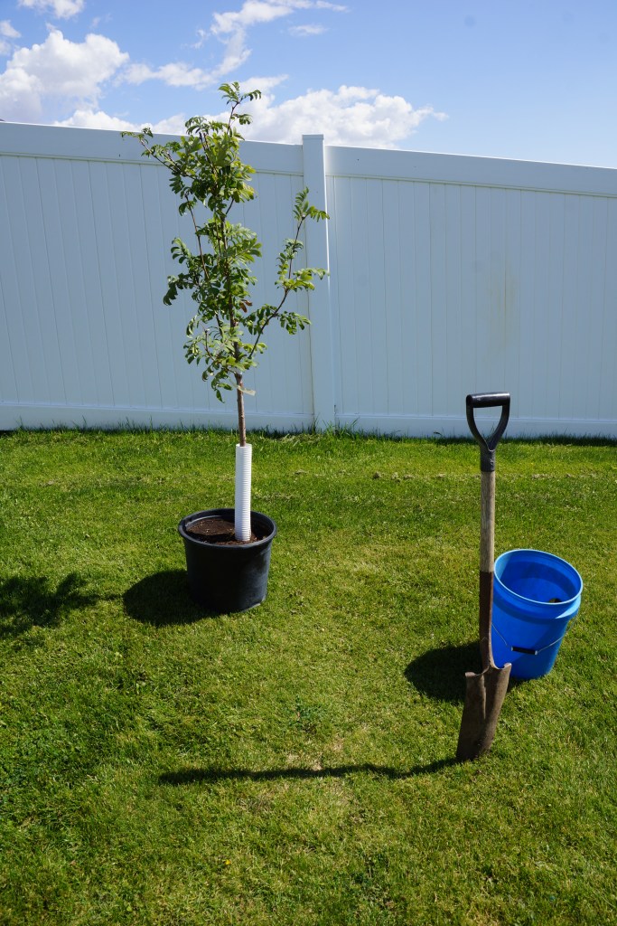 Normally I dig a hole that is twice the size of the pot of the tree. However in this circumstance, I recently planted grass in this area and the soil is very loose. Also this is a small tree, and these guys grow like weeds once you get them some water. They don’t compete like other deciduous trees do with grass. The grass will not be a problem.
