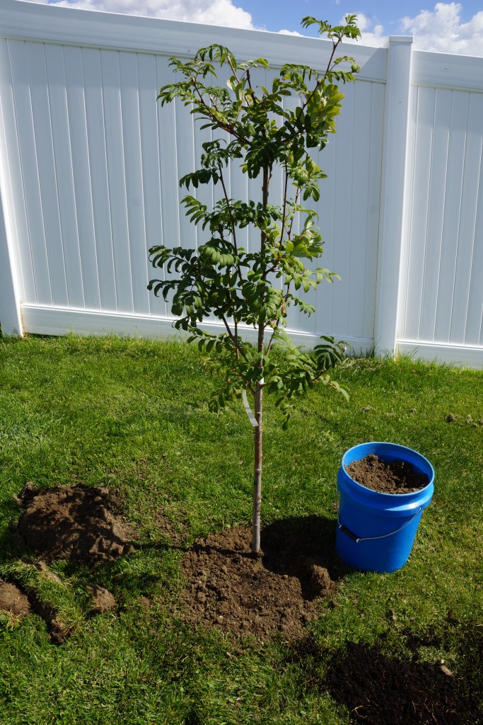 5. Now fill it up to the top, but don’t go too deep, the graft or root flare should be seen above the soil. Now you can build a small outer dirt moat around the tree to help with water retention just go in a circle around the edge of the hole a few inches tall will be fine. But like I said, this is very loose soil in the spot where I planted so no need for that in my circumstance. There is also a sprinkler a few feet away that will douse this tree quite regularly.